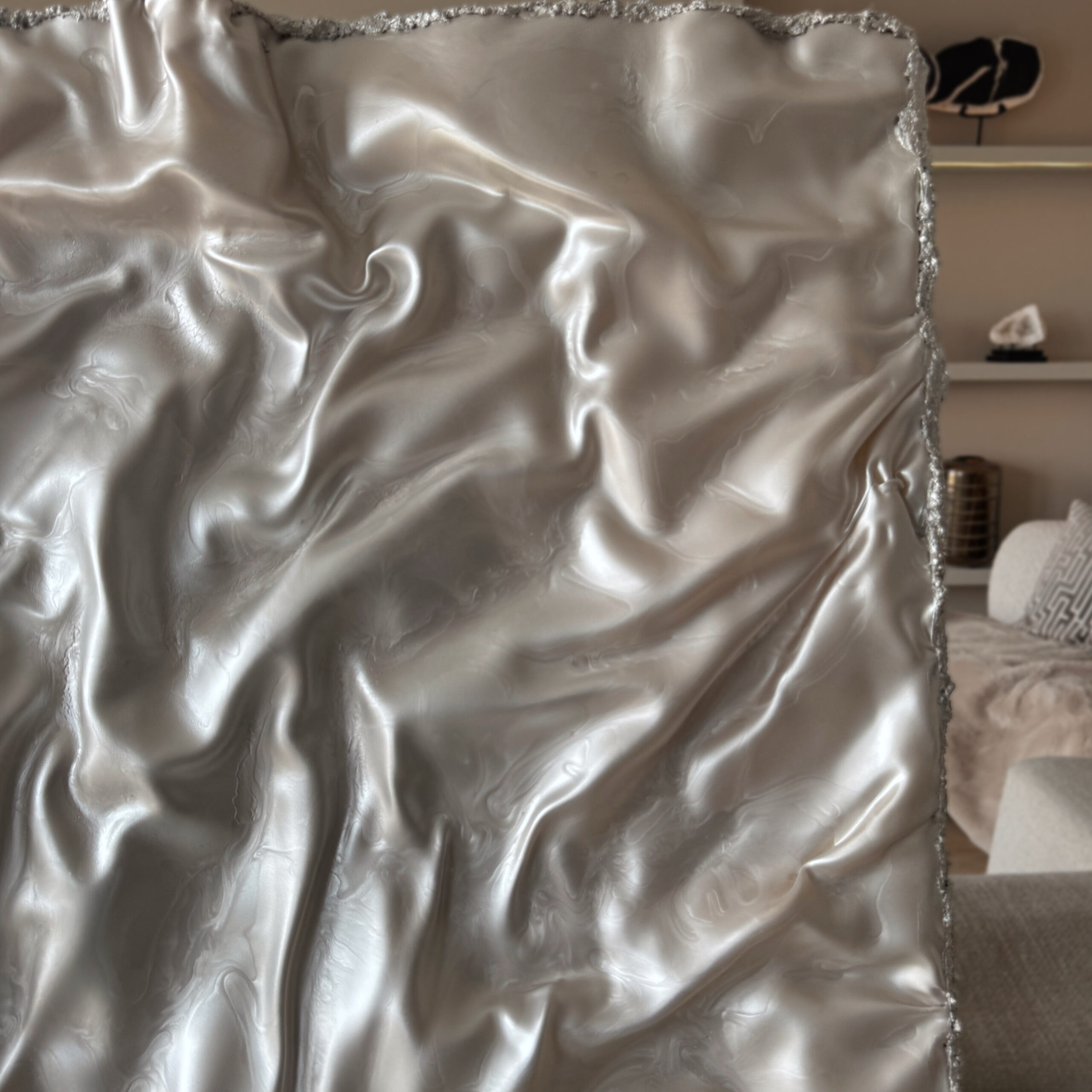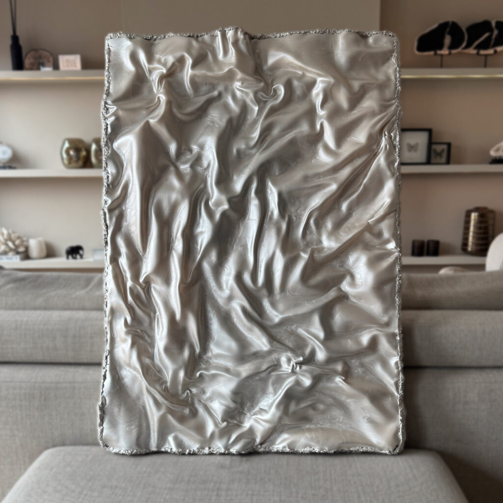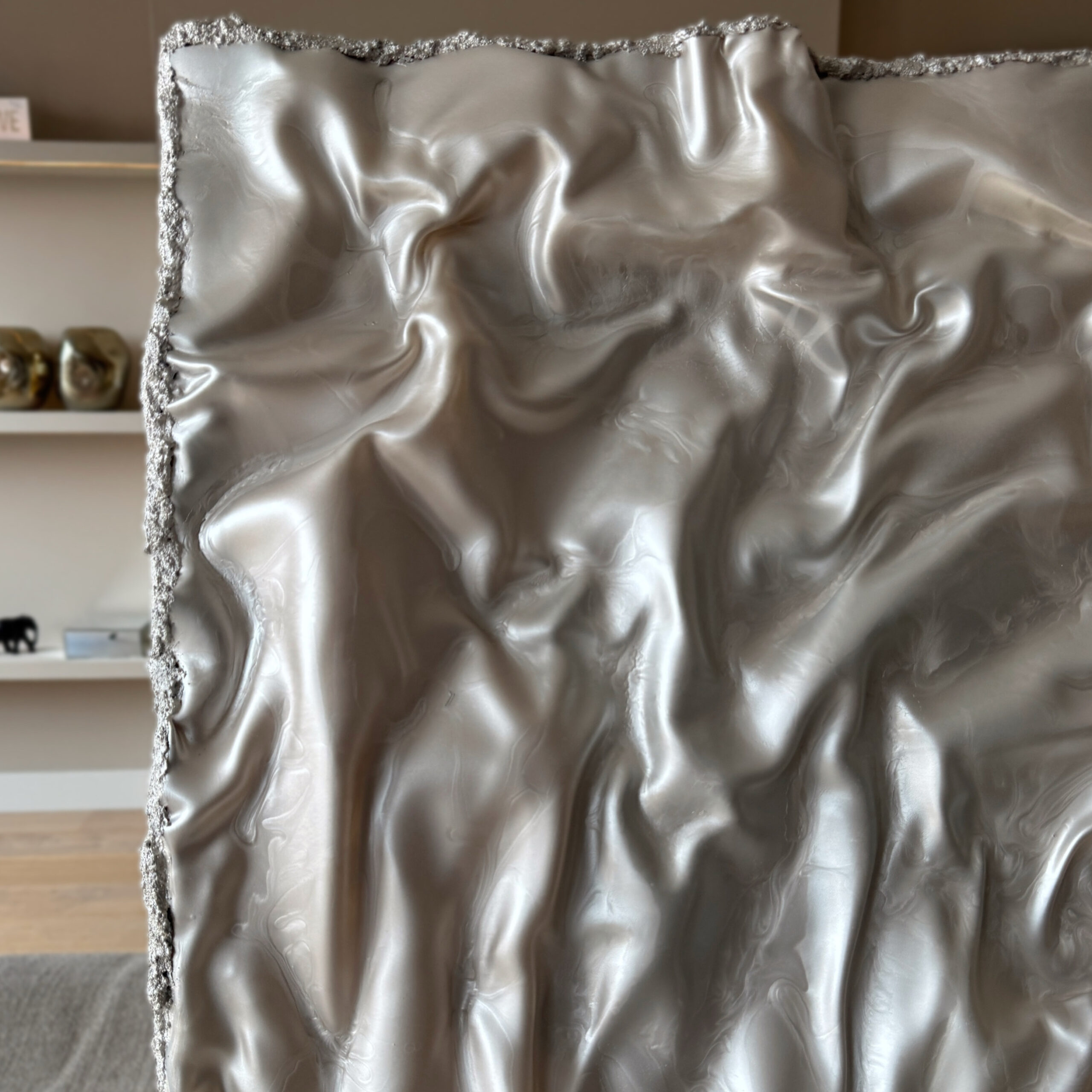 This piece is shaped in flowing waves with strong movement and volume. The surface shifts like the inside of an oyster, with a pearl tone that changes with the light.